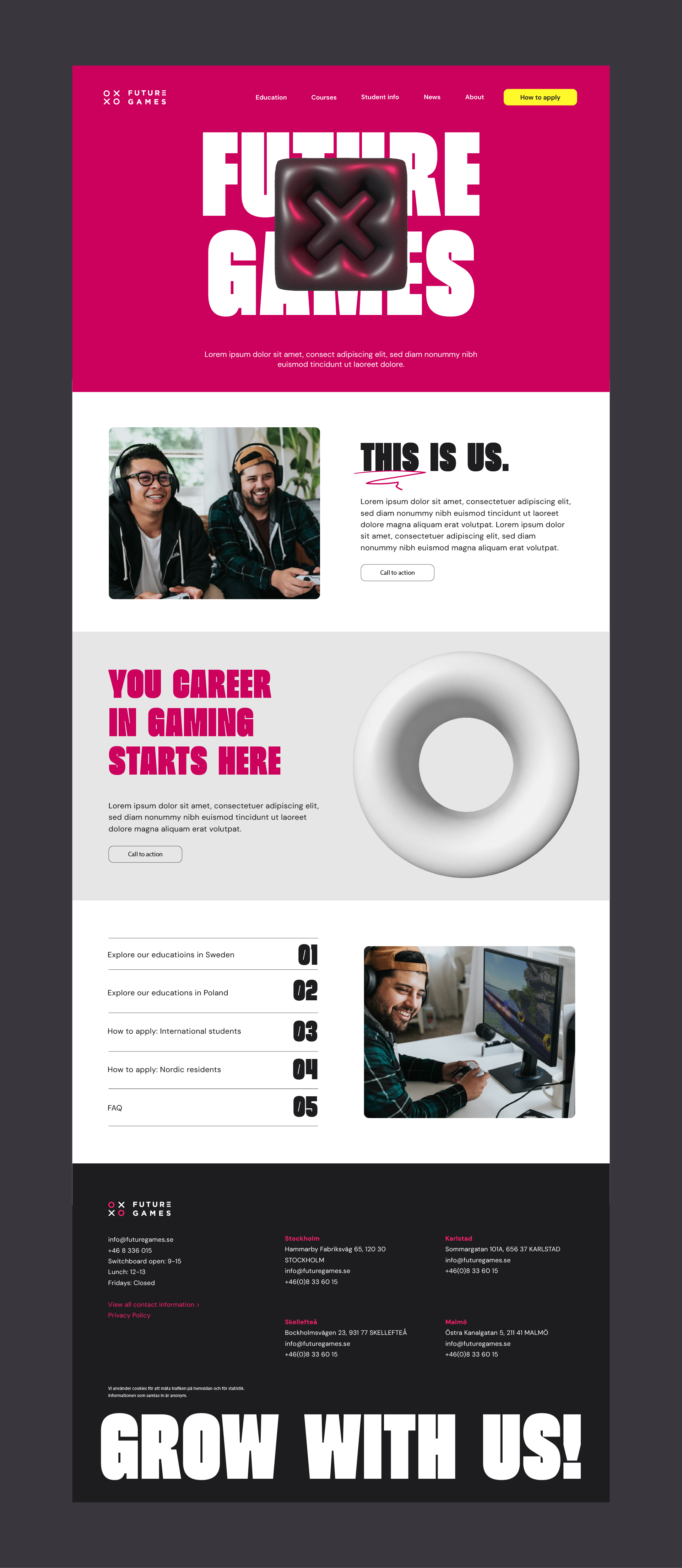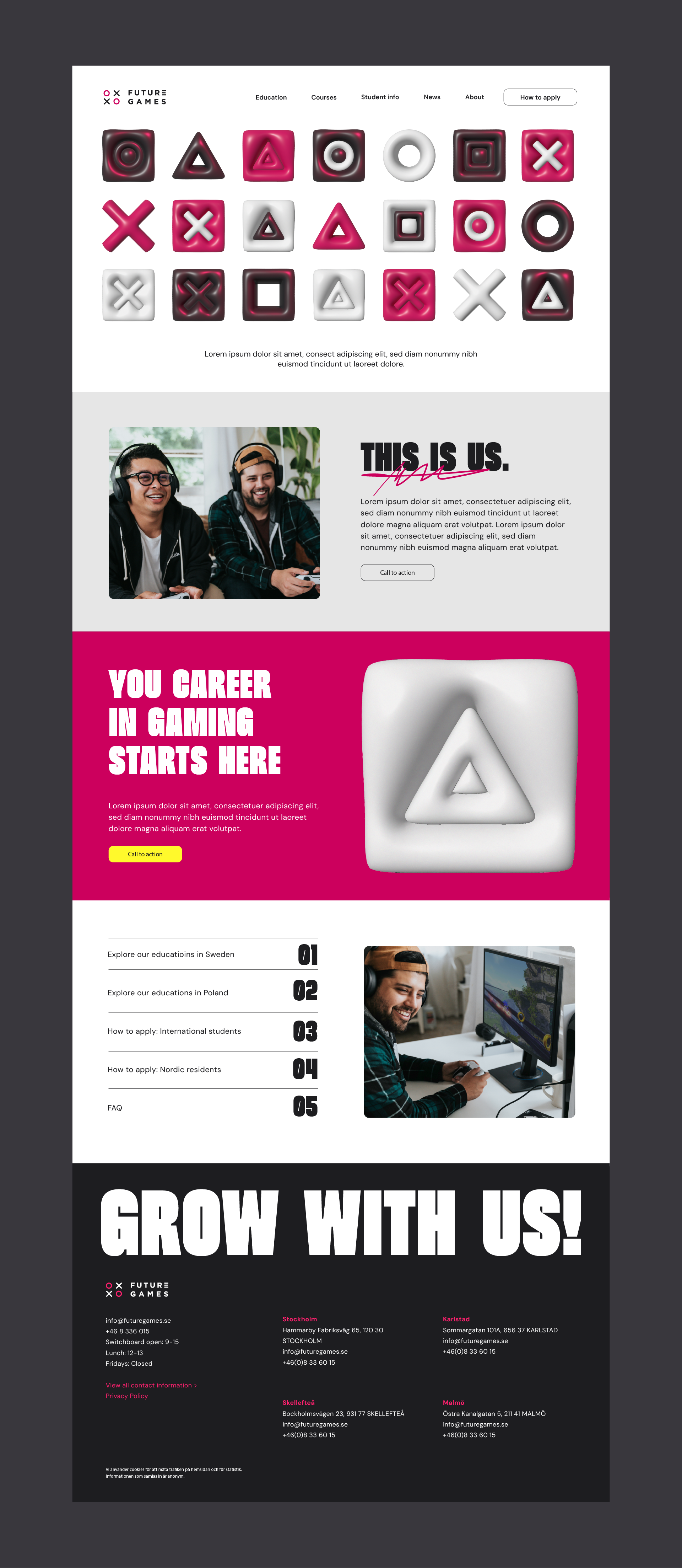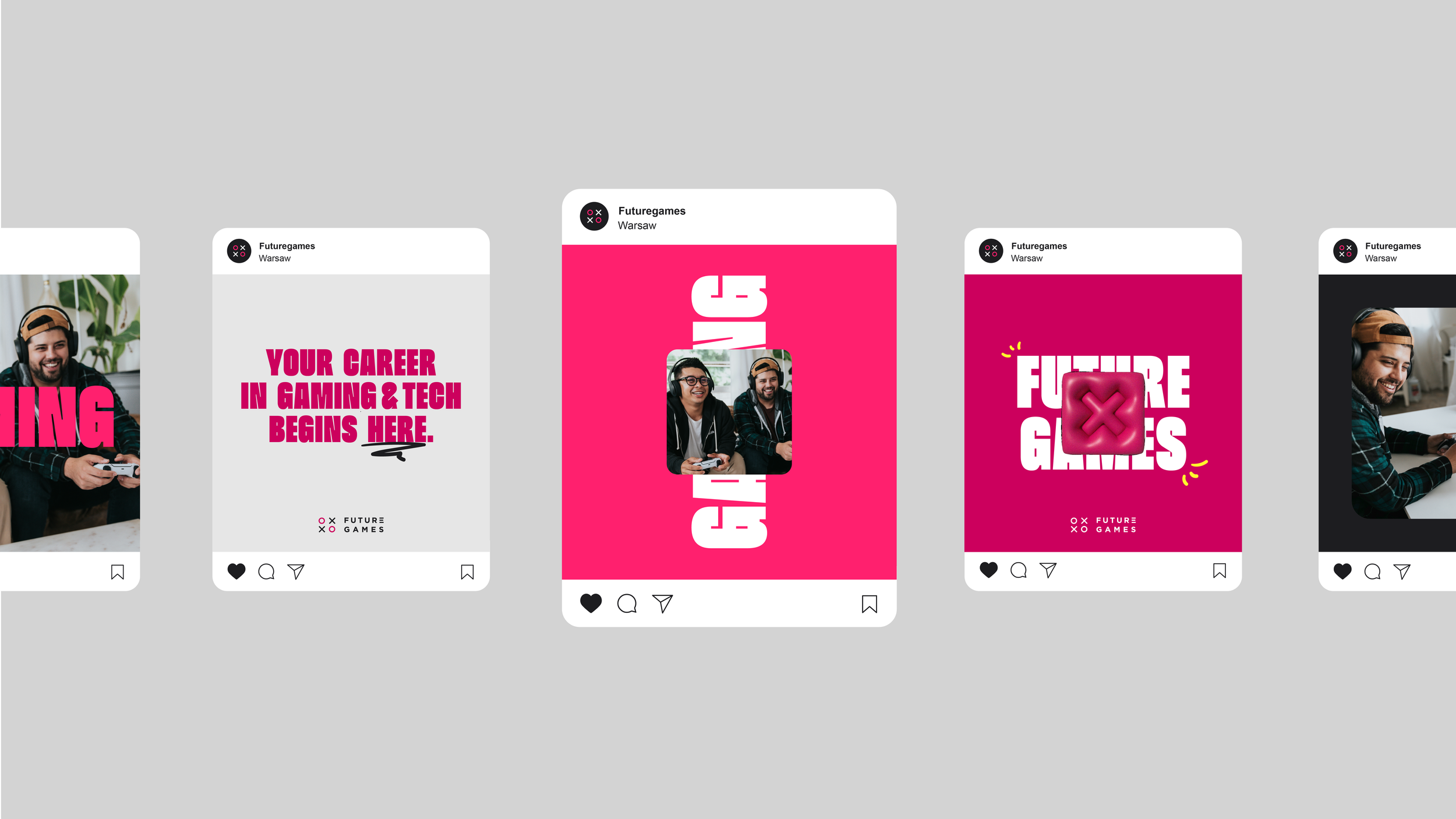 Future Games and Changemaker Educations, internationally recognised game-dev and tech schools, have merged under the brand Future Games. The visual identity needed to be updated to reflect both the gaming and tech industries. The goal was to create a refreshed and modern identity that signaled change, while still maintaining recognition among the target audience. As part of the brief, the brand’s expression was also required to have a better balance between masculine and feminine qualities to ensure a more inclusive feel.