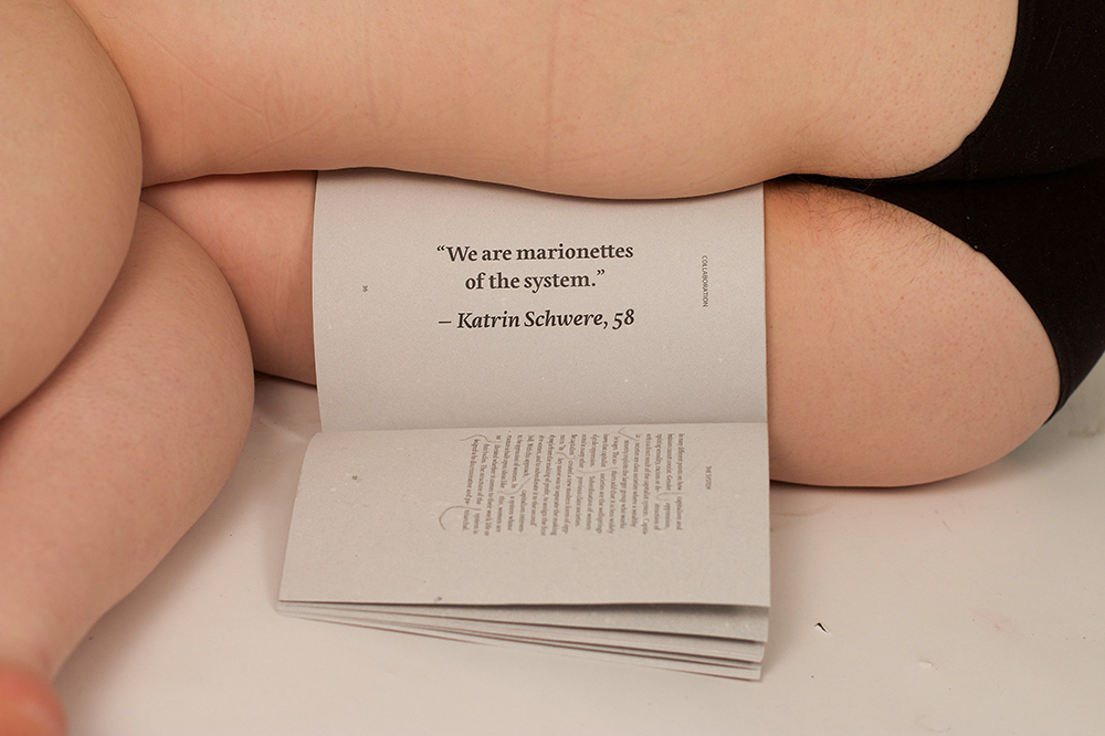 At the beginning of the process, I started an experiment — I stopped shaving on all parts of my body. I grew out my body hair not only to challenge the norms but myself as I. This experiment became an important aspect of my self-development, providing insights into what role I have in society. Documenting my thoughts in a diary, I included these writings into an artist book, together with a theoretical text from my research and quotes from collaborative interviews.